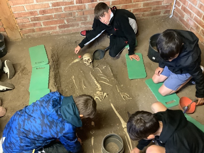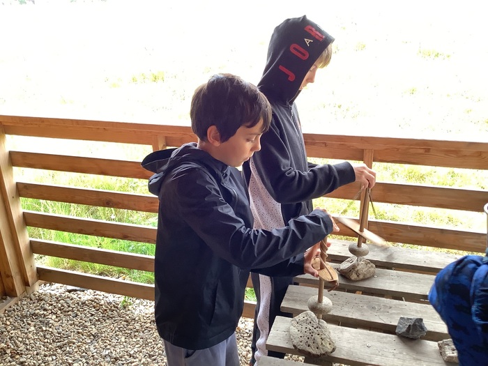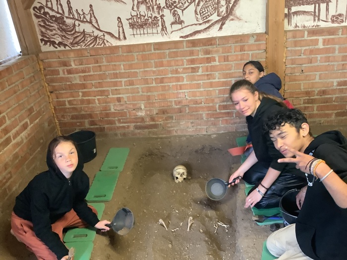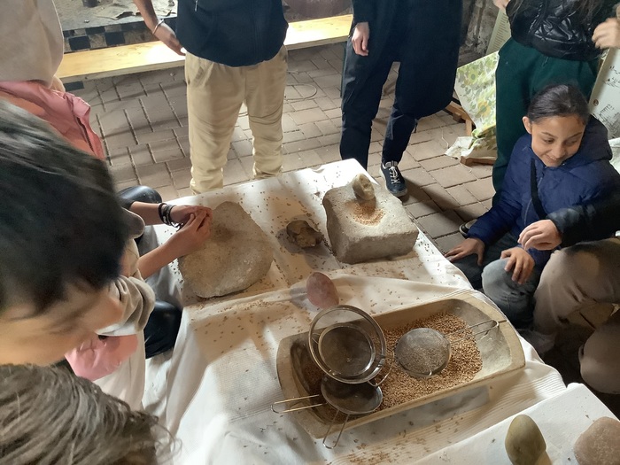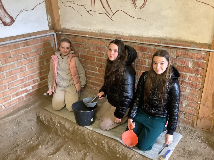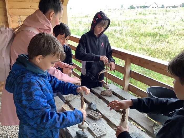 I přes nepřízeň počasí se žáci s nadšením zúčastnili praktických dílen, které byly součástí exkurze. V těchto dílnách si mohli vyzkoušet tkaní látek, dva způsoby mletí obilí: drcením mezi kameny i na žernovu, výrobu mouky, broušení kamenů, ale i práci archeologa. Dokonce se šesťáci naučili podle předmětů, které odkryli v jednotlivých hrobech, rozeznat okolnosti života pravěkých lidí.
