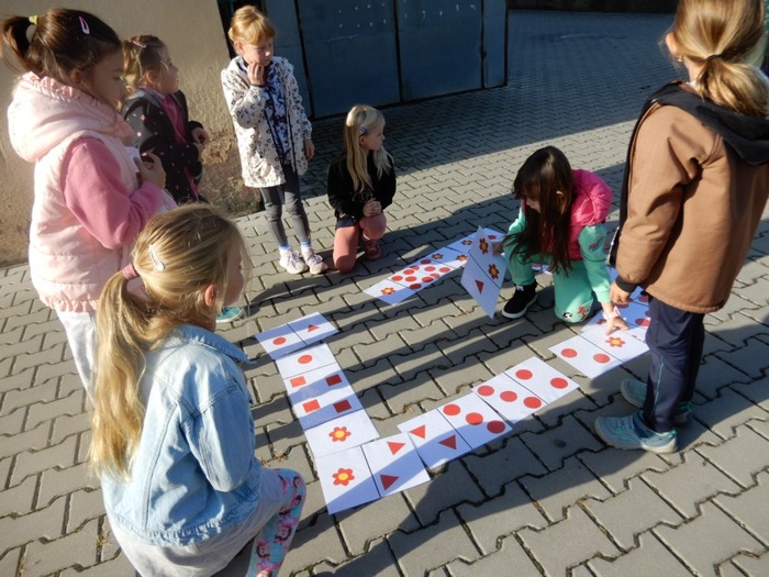 Konečně máme hezké babí léto. Děti z 1.C si dneska venku zopakovaly geometrické tvary, počítaly kytičky a puntíky, stavěly domino, skládaly matematické domečky, četly číslice, a nakonec si i zasportovaly.