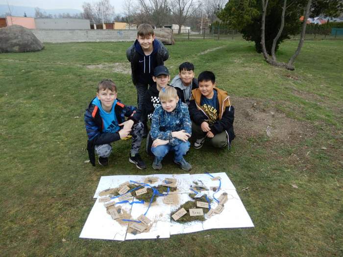 Žáci 5.A využívají hezké jarní dny a opět se chodí učit ven. V rámci vlastivědy vytvářeli Českou republiku, v češtině pomocí přírodnin procvičovali slovní druhy a zdvojené souhlásky, v bloku matematiky pracovali se zlomky. Nenásilnou formou poznávají různé přírodniny a postupně se učí, proč je potřeba přírodu chránit. Doufejme, že hezké počasí potrvá i nadále a že nám umožní ve venkovní výuce pokračovat.