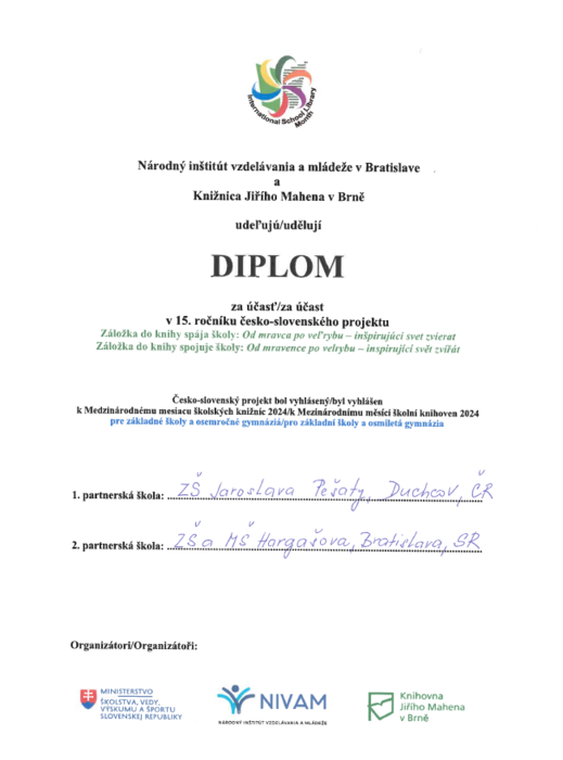 Cílem česko-slovenského projektu je navázání kontaktů mezi českými a slovenskými základními školami a osmiletými gymnázii a podpora čtení prostřednictvím výměny záložek do knih. Žáci z České republiky vytvoří záložku do knihy, na níž libovolnou technikou ztvární téma česko-slovenského projektu Od mravence po velrybu – inspirující svět zvířat, a vymění si ji se žáky z přidělené partnerské školy ze Slovenské republiky.