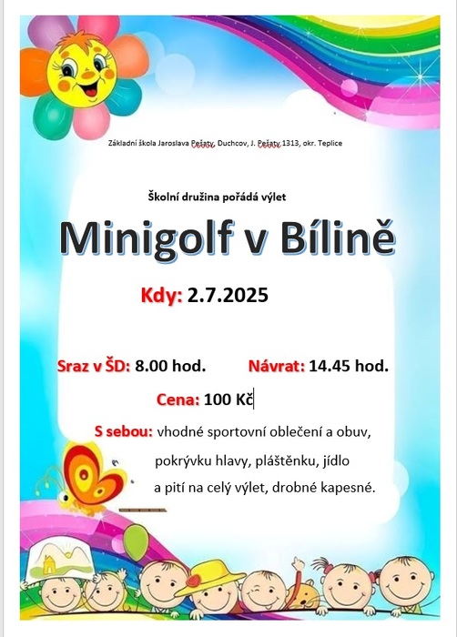 V Bílině jsme jako doma a proto jsme se rozhodli turnaj v minigolfu zopakovat. Není to daleko, autobus nás kousek odveze a pak se vydáme cestou krásného lázeňského parku, který nás zavede na minigolf. Nebudou chybět hranolky ani palačinky.