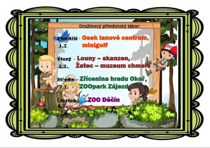 Tak jako každý rok, tak i letos jsme si s naší družinkou připravily pro vaše děti příměstský tábor. Na každém plakátku najdete informace k jednotlivým výletům.