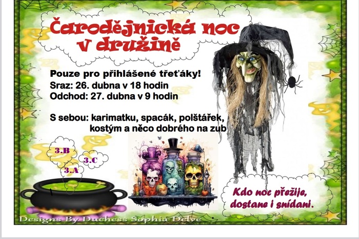Noc v družince je pro každé dítě velkým přáním a dobrodružstvím, a proto jsme se rozhodly, že jim ho splníme. Na podzim jsme uskutečnily Halloweenskou noc pro druháky, teď jsou na řadě třetáci a jejich Čarodějnická noc v družině a v červnu nás čeká rozloučení se čtvrťáky. Podmínkou je řádně vyplněná přihláška, kterou děti obdrží od své paní vychovatelky. Podrobné informace najdete na letáčcích na našich vývěskách u školní družiny a tady na webových stránkách. Nejen děti, ale i my se na to moc těšíme!