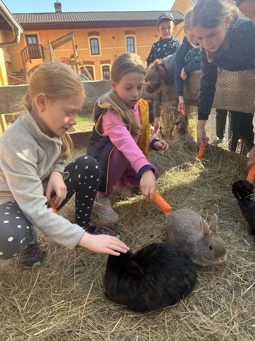 Ani během velikonočních prázdnin jsme ve školní družině nezaháleli, vydali jsme se na výlet na Selský dvůr v Braňanech a čekal nás den plný zábavy, sluníčka a zvířátek. Děti si mohly vyzkoušet jízdu na koních, podívat se mezi králíky a pohladit si oslíky, ovce, koně i další zvířátka, která statek obývají. Nadšení bylo veliké a pro mnohé to byl první takový zážitek. Po všech dobrodružstvích přišlo vhod opékání buřtů a příjemné posezení u ohně. Děti si také měly možnost zakoupit drobné sladkosti, malinovku, či nanuky. Výlet jsme zakončili návštěvou místního dětského hřiště, kde jsme nechali poslední zbytky energie. Z celého dne jsme byli naprosto nadšené a měli radost, že jsme si ho užili.