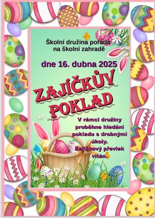 Hody, hody doprovody, já jsem malý zajíček, utíkal jsem kolem vody a ztratil košík s pokladem! A kudy že jsem utíkal? To se dozvíš podle značek, které tě po vyluštění hádanek dovedou k mému ukrytému pokladu na naší školní zahradě.